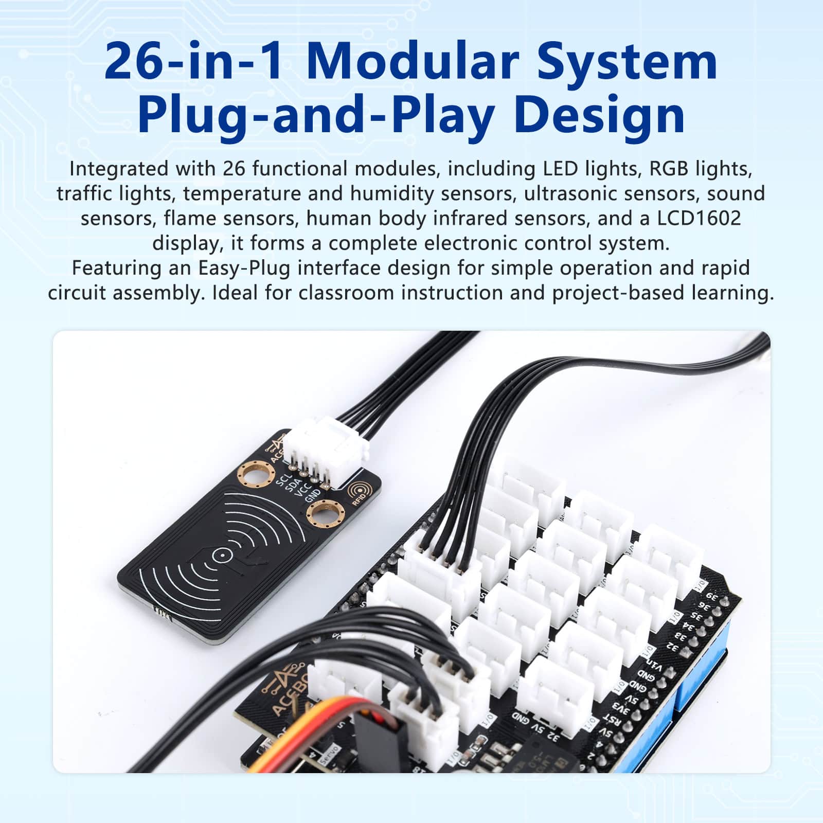 26-in-1 Module System: Integrates 26 functional modules, including LED, RGB light, traffic light, temperature and humidity sensor, ultrasonic sensor, sound sensor, flame sensor, PIR motion sensor, and LCD1602 display.