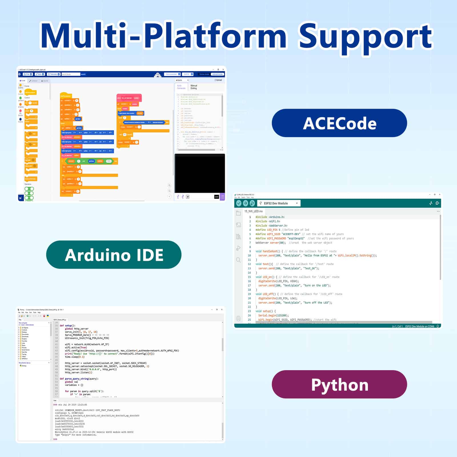 Multi-Platform Programming Support: Supports Blockly graphical programming, Arduino IDE, and Python. Covers beginner to advanced learning paths. Adapts to different learning stages.